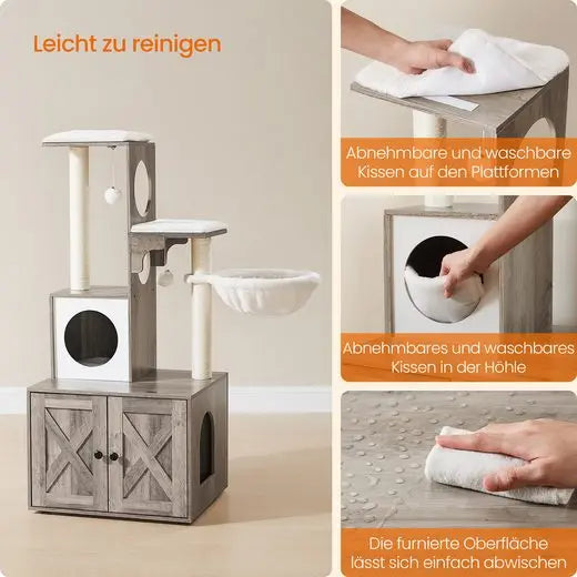 Platzsparend: Kombiniert Kratzbaum und Katzenklo-Versteck in einem Möbelstück.
